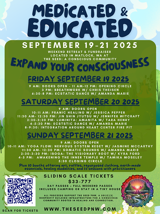 We created a really intentional container at The Seed for Medicated & Educated. Our team will be available all weekend with trauma-informed peer support, therapist, and energy workers to support your journey.